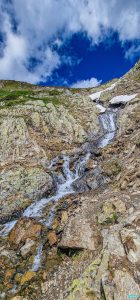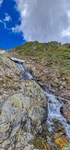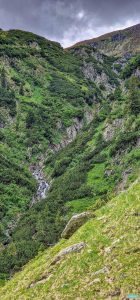 Descățărarea pare neverosimilă în acel punct, căci panta e agresivă cu apucături prăpăstioase. Râul însăși formează o serie de cascade ce-și împart diferența de nivel de aproximativ o sută de metri. Între două cascade, totuși, după o voltă sumară spre Vest, piciorul omului a găsit o palmă de pământ ce leagă un tăpșan înierbat de-un intermezzo-n stil allegro ma non-troppo descris de versantul stâng geografic, iar pe-a cea palmă, pășind cătinel peste pârâu, cât să nu ne dăm de-a dura, ne-am scurs și noi.