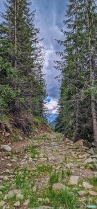 Având burțile puse la cale, ne-am avântat în pădure călcând alene pe drumul aspru, accesibil doar celor mai ambițioase mașini și celor mai voinice și aventuroase mârțoage. Rampele sunt construite oblu, explicit, fără perifrază, iar apa ploilor a tot săpat în ele până le-a dezgolit. Un gând fugar, un ochi aiurea și numaidecât te poți da de-a berbeleacul.