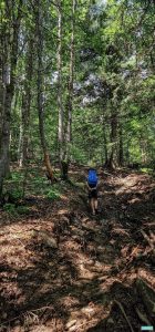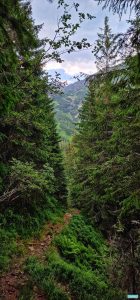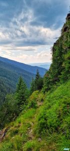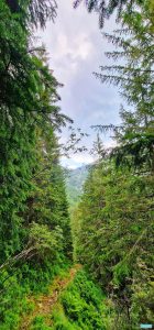 Coboară în coastă cu pioasă iscusință, menținându-se între 1700 și 1800 de metri, drept, curat și distinct, cu puține blocaje de arbori căzuți, blocaje vechi și parțial curățate, semn că și-a mai făcut cineva dreptate în trecut poate nu mai demult de câțiva ani. Mai sunt și vreo trei mici alunecări de teren, trecute lesnicios, însă nu se știe niciodată cum pot evolua.