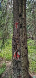 Ne-am învârtit oleacă până am brodit continuarea potecii: cam din mijlocul poienii cotește 90 de grade, de pe axa Nord Vest pe axa Sud Vest, printr-un promontoriu format de poiană, unde-am găsit și câteva relicve ale Crucii Roșii. Poteca-i de fapt destul de lată pe-acolo și, în imediata apropiere a stânei, pe partea dreaptă, sunt două izvoare.