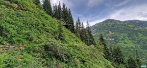 Marcajul continuă cel puțin teoretic pe un afluent al Mijei Mici pe un culoar de jnepeniș, fără a fi foarte clar în teren cum s-ar putea face asta, țiind cont și de urcușul aspru ce se-ntrezărește (totuși, iată un jurnal de tură ce pune-n valoare și creasta Mijei, ori creasta Zăvoaiele). Noi am continuat poteca bine definită ce tivește pădurea și iese într-un picior învecinat, Dâlma Mijei, versantul drept geografic al văii Mija Mare, punctul de origine al potecii căutate de noi și fieful unui urs bătrâior zărit de Renato și dispărut din câmpul vizual până să-l văz și eu.