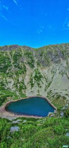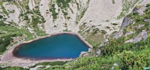 Lacul este un loc tare liniștit, deși nu eram singurii acolo: ajunsese înaintea noastră o familie de străini, probabil expați. Pereții abrupți, stâncoși sau acoperiți de mult grohotiș și puțină vegetație, închid aproape ermetic lacul. După forma luată la intrare, aș zice că aproape-l ocrotesc cu brațele.