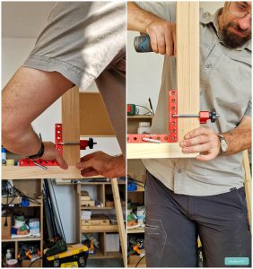 Le-am asamblat folosind șuruburi trase prin găuri buzunar, calând părțile componente prin niște vincluri din aluminiu foarte precise pentru cât de puțin au costat; după culoare aș zice că sunt o copie după un produs similar Woodpecker. Marele lor avantaj este că pot înghiți o grosime de până la 100 mm și poți muta șuruburile de prindere după cum este mai convenabil. De altfel, cred că le-am pomenit și când am făcut avizierul.